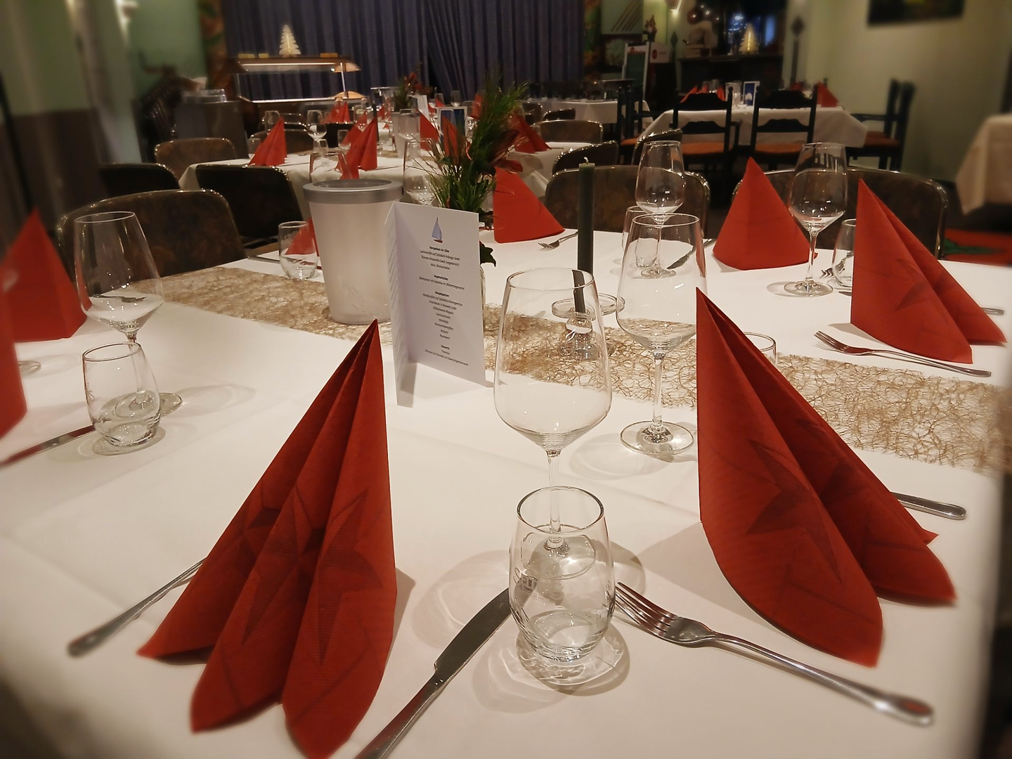 Unser geräumiger Saal beherbergt mühelos größere Gesellschaften, die wir gerne mit unserer Küche verwöhnen, sei es à la carte oder mit einem individuell mit Ihnen zusammengestellten Büfett. Sprechen Sie uns einfach an!